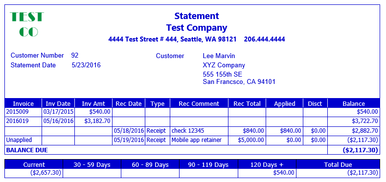 When you are emailing invoices you can optionally attach PDF statements for the requested customers. Statements reflect unpaid invoices, paid or partially paid invoices and any unapplied cash receipts (such as the retainer in the statement below.) Statements can also be viewed, printed or exported to a file in the Reports section.